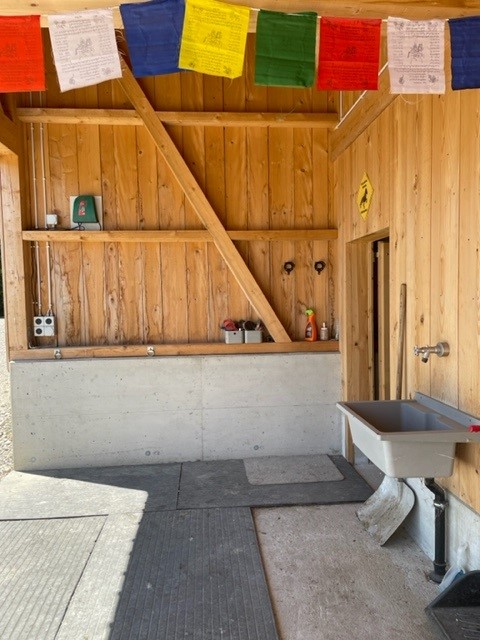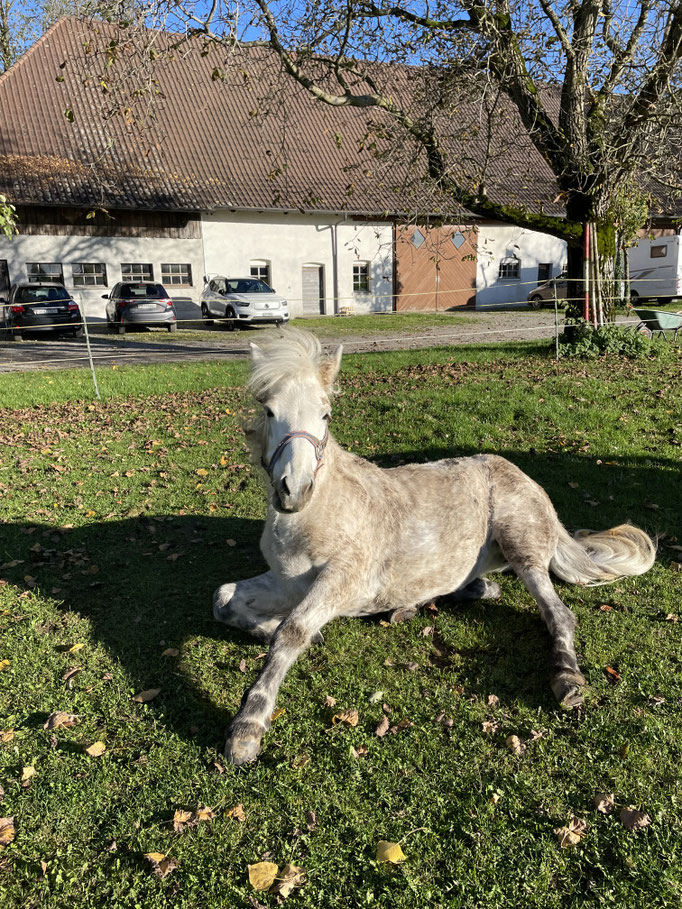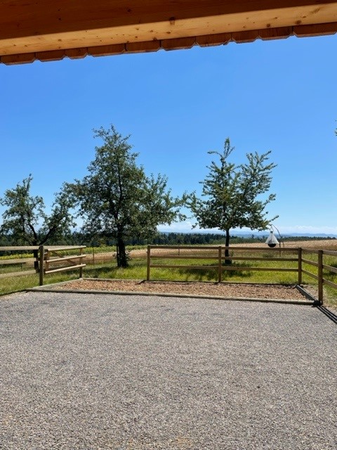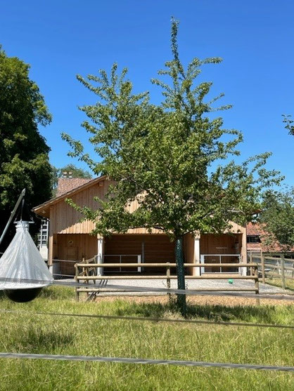 Der Offenstall verfügt über eine mit Hackschnitzel eingestreute Liegefläche und einem direkten Weidezugang. Die Pferde können jeden Tag stundenweise auf die Weide, sofern es das Wetter zulässt.