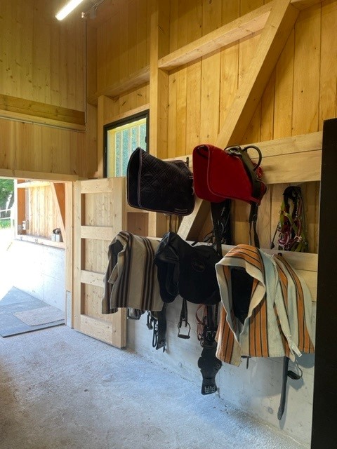 Im Stall gibt es eine Sattelkammer und einen überdachten Putzplatz. Es ist ein kleiner Rasenreitplatz vorhanden.